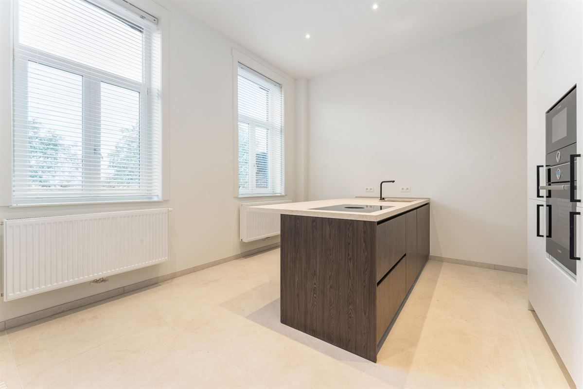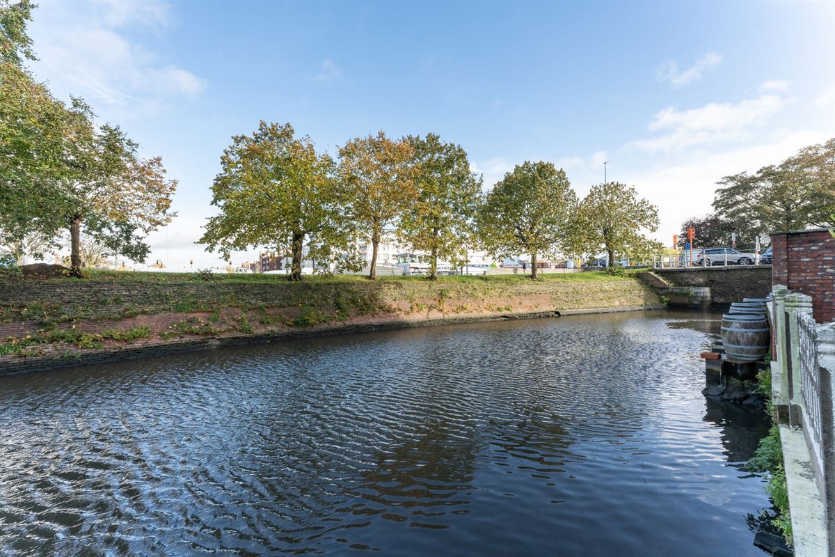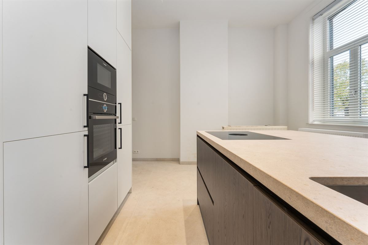 Op het gelijkvloers de leefruimte met sierhaard en prachtige leefkeuken met uitzicht op het water, hoge plafonds doorheen de hele woning.