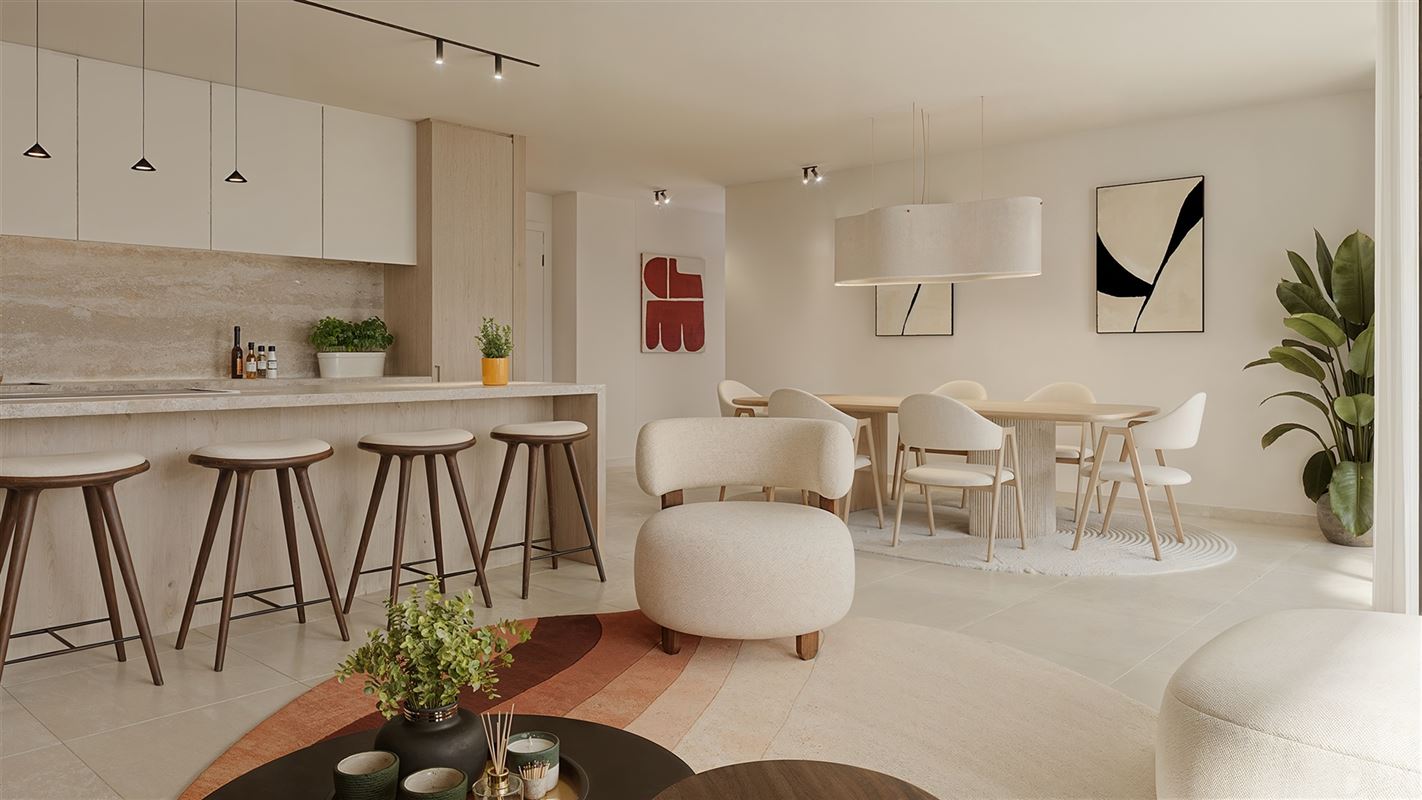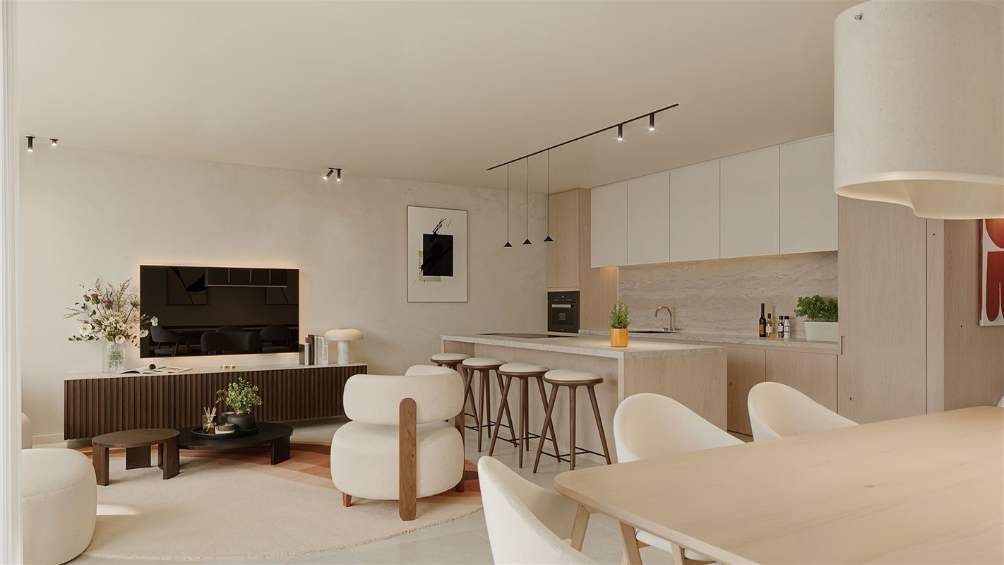 In de kleinschalige en kwalitatieve residentie ‘Orient’, gelegen in het centrum van Oostkamp, vindt u dit ruime en doordacht ingedeelde gelijkvloers appartement met privatieve tuin en terras. De residentie telt slechts 6 appartementen en 2 penthouses en bevindt zich op wandelafstand van winkels, horeca, scholen en openbaar vervoer. Dit gelijkvloers appartement beschikt over een inkomhal met gastentoilet, een lichtrijke leefruimte met open keuken en keukeneiland, twee slaapkamers, een badkamer, een praktische berging en een ruim terras met aansluitende tuin. De hoogwaardige afwerking en het gebruik van duurzame technieken zoals vloerverwarming, warmtepomp en zonnepanelen zorgen voor maximaal wooncomfort en energiezuinigheid. Daarnaast beschikt elk appartement over een eigen autostaanplaats en is er een overdekte fietsenstalling voorzien. De combinatie van een centrale ligging, een privatieve tuin, kwalitatieve afwerking en duurzame voorzieningen maakt van dit appartement een unieke woonkans. De aankoop is bovendien mogelijk aan het verlaagde BTW-tarief van 6%.